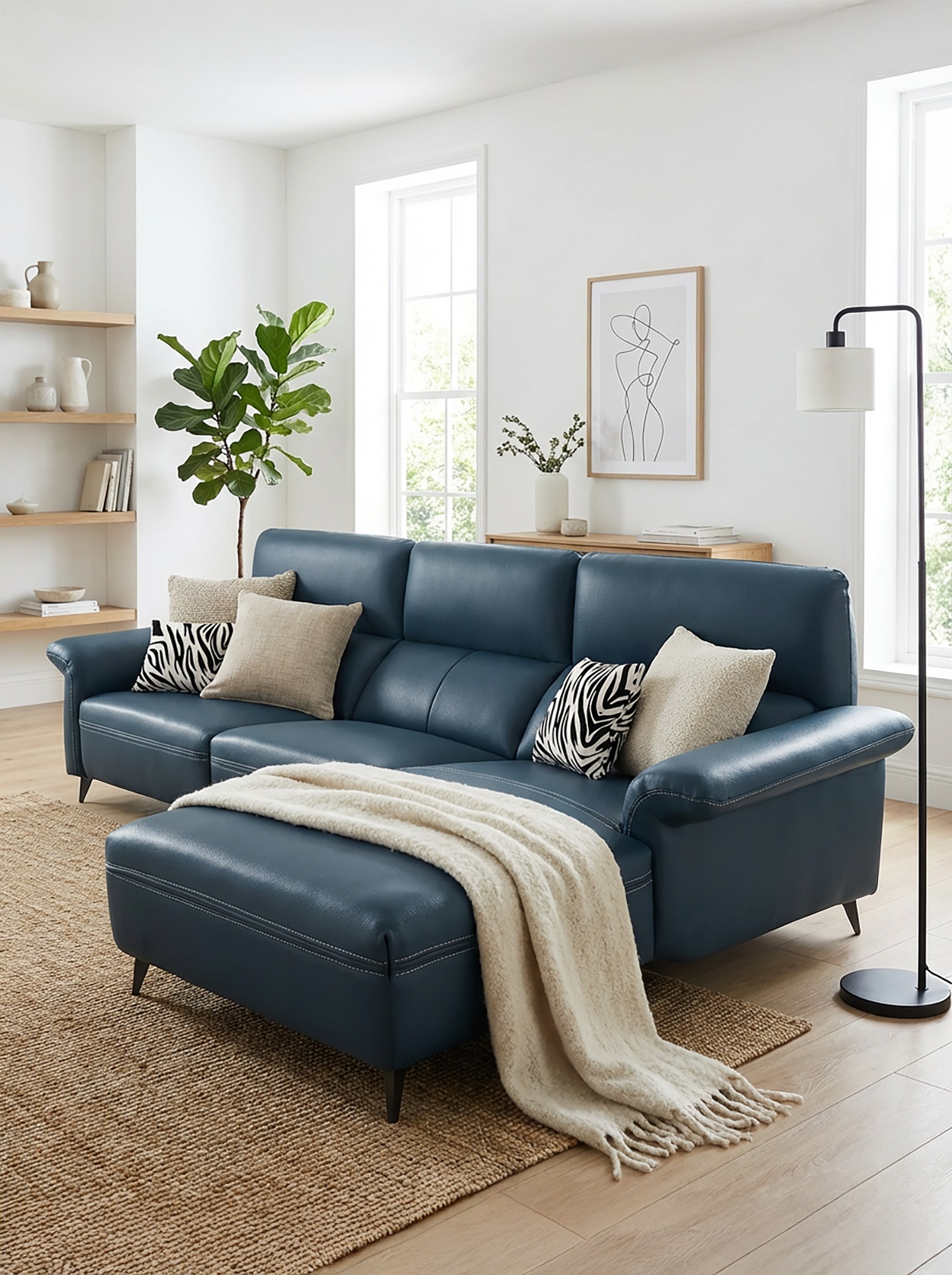 高背設計與分段式背枕的精準支撐,搭配斜扶手枕與飽滿坐墊營造慵懶的包裹感,並利用金屬高椅腳與L型貴妃座,在展現輕奢時尚感的同時,提供極致的伸展放鬆空間
