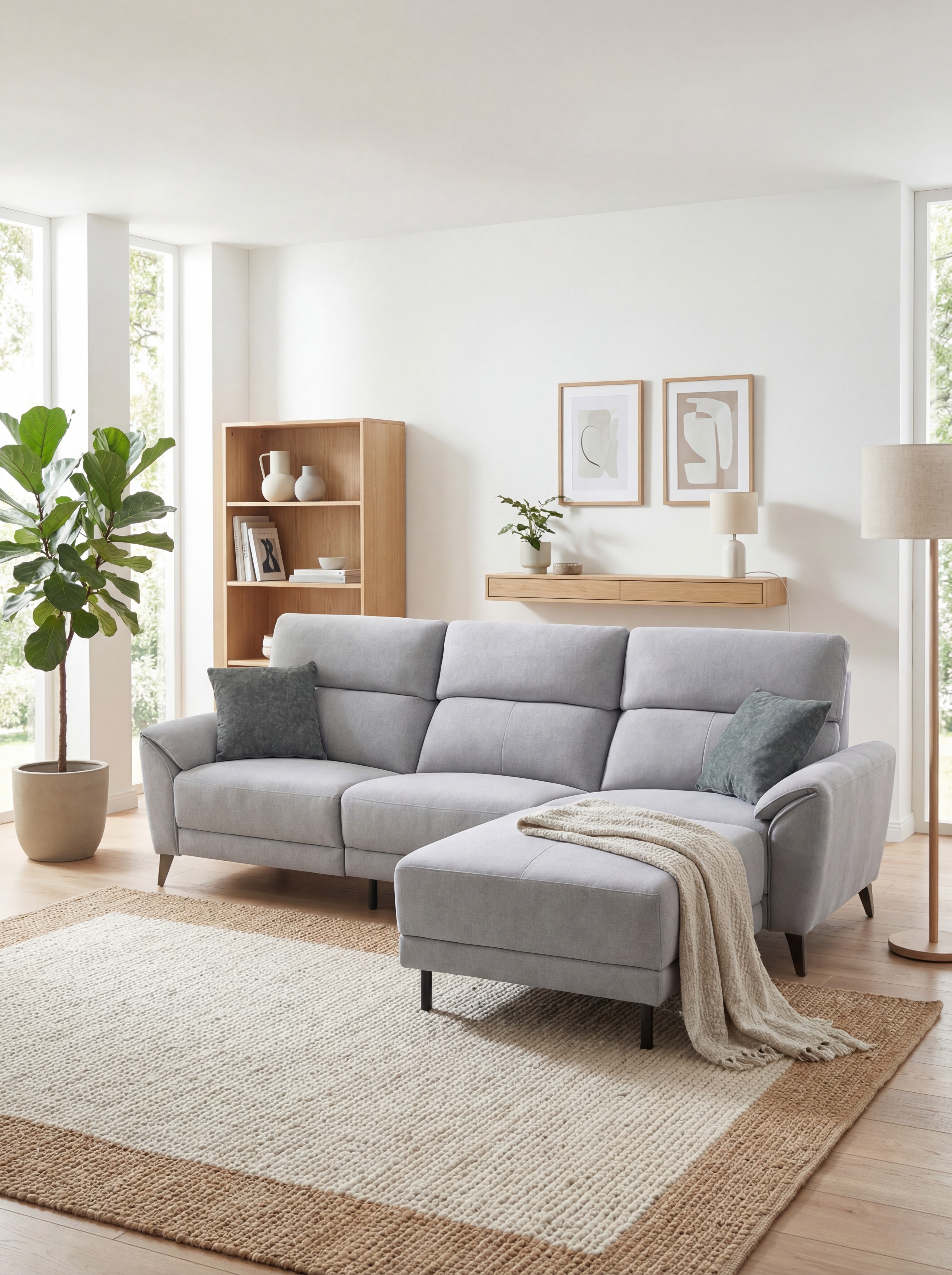 L型貴妃座與靈活的模組化設計,透過高背設計與分段式背枕提供精準支撐,搭配流暢的斜扶手枕、飽滿坐墊與俐落的金屬高椅腳,打造出兼具極致包覆與輕盈美感的休憩空間