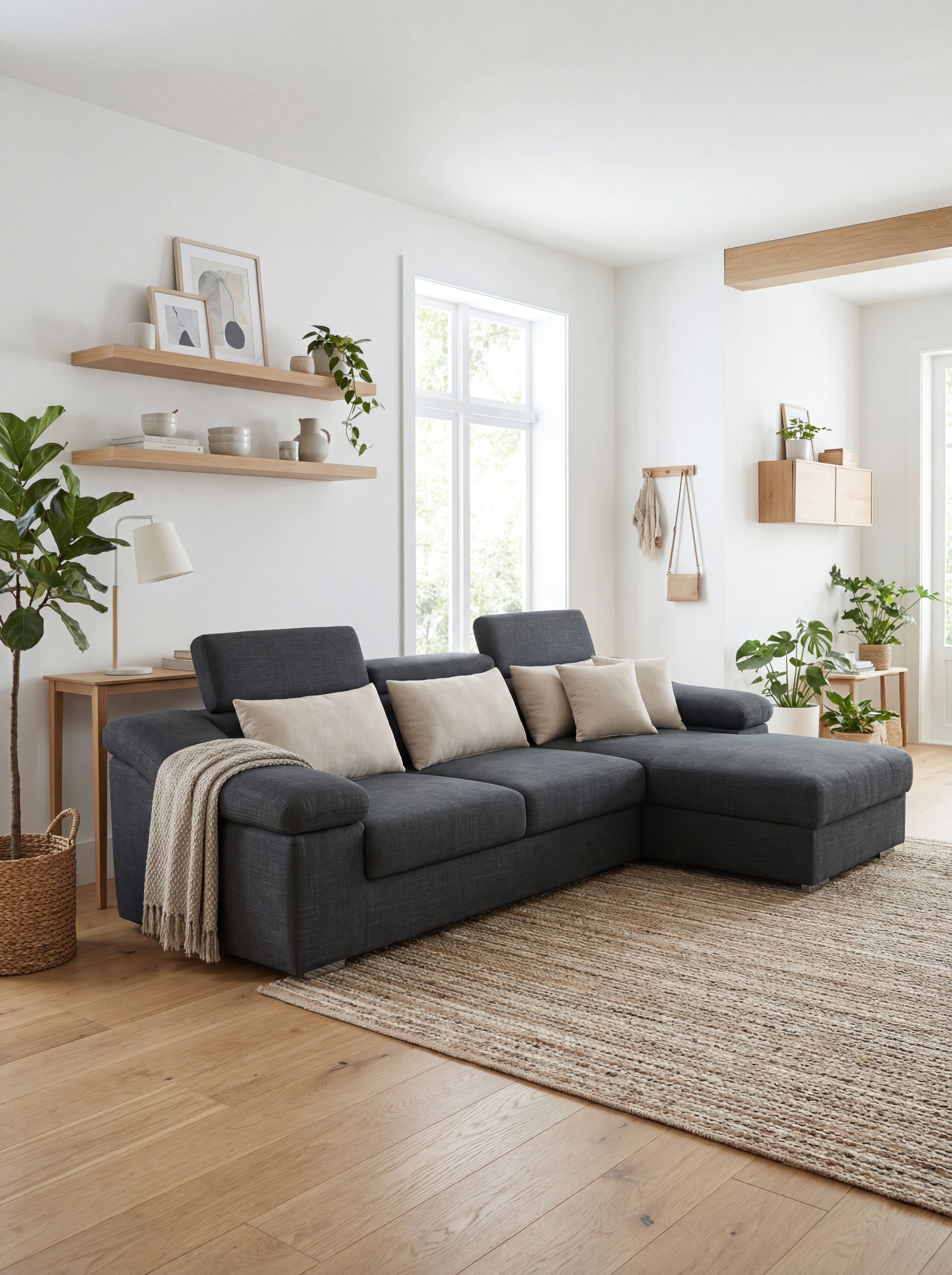 L型貴妃座與靈活的可調式頭枕,在高背設計與厚實扶手枕的包覆下,搭配飽滿坐墊與低重心設計,營造出極致安穩且兼具現代大器的舒壓座感