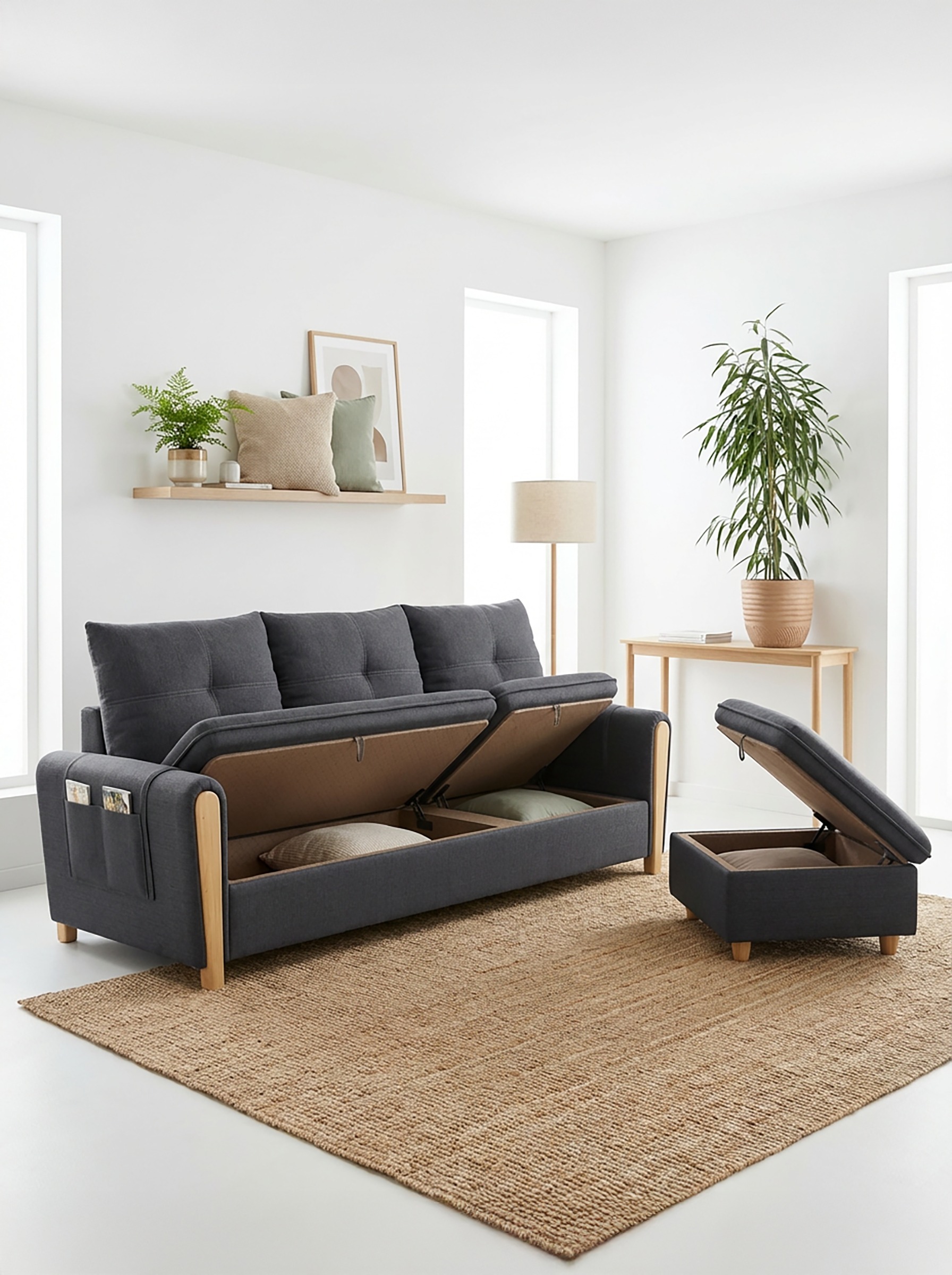 低重心設計與高背設計,在營造視覺開闊感的同時提供極致支撐,更透過坐墊、腳踏及側邊三維度強大的隱形收納空間,為L型貴妃休憩領域打造出極致機能且乾淨俐落的居家體驗